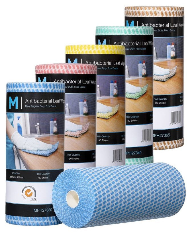 Antibacterial leaf wipes are hygenic and highly absorbent. Dispensed on a perforated roll for convenience, they are reusable and machine washable. These wipes are made from a regular duty 60gsm, 70% viscose, 30% polyester mix. Available in five different colours to prevent cross contamination.